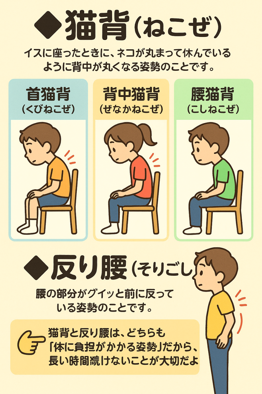 背中猫背(せなかねこぜ):肩が前に丸まって、背中も丸くなる姿勢。ランドセルやカバンが重いとこうなりやすいです。